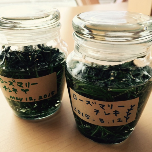 今回つくったローズマリーのチンキ。最低2週間から1ヶ月くらい冷暗所でねかせるとできあがり。