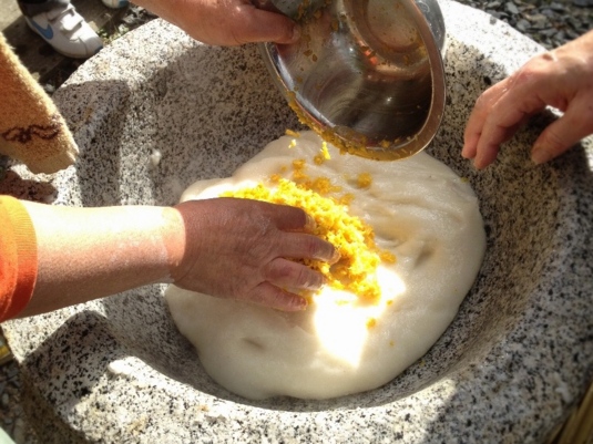 小松菜餅やブルーベリー餅、玄米餅も搗いて、色とりどり。
