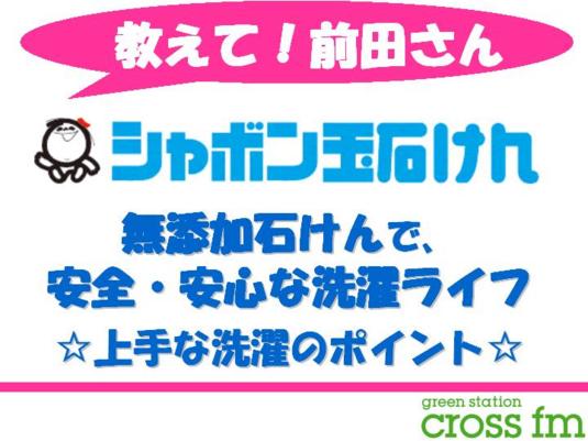 「cross fmファーム」サポート企業「シャボン玉石けん株式会社」から、石けんアドバイザーの前田さんをお迎えして、「シャボン玉石けんを使った 安心・快適な生活の知恵を伝授してもらう」コーナーです♪♪