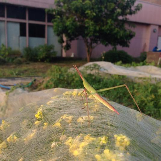 そして夕映えに照らされパオパオの上で佇むバッタくん。