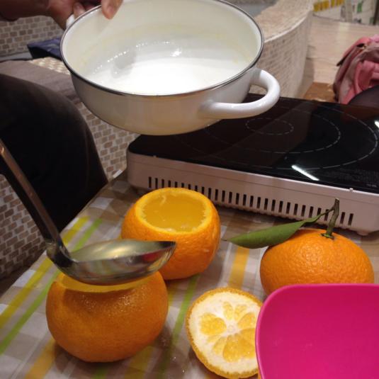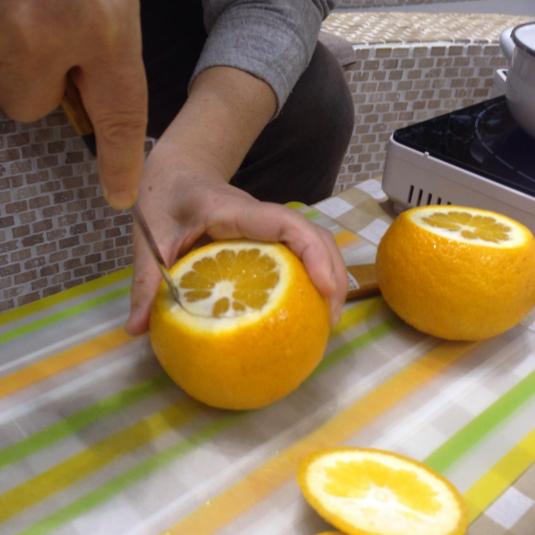 さとみさんちの甘夏を使ってキレイなカップの作り方も教わり、