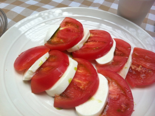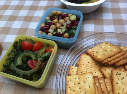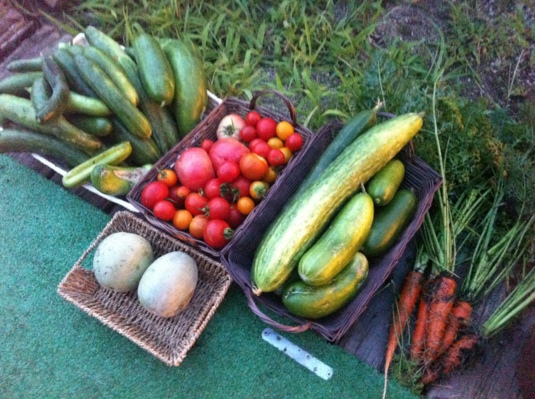 この日の収穫野菜とクロスファーマーの聖美さんが持って来てくれたトマトとモッツァレラの「カプレーゼ」やピクルスなどで、プチ・ランチタイムに♪