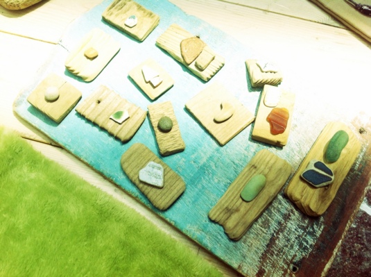海に流れ着いた流木やビーチグラス、陶器のかけらなどの自然素材を使って創る作品♪