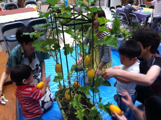 「黄瓜」も屋上で育っていますが、10階のKOKURA natu-gardenに、アドバイザーの上野さん(上野園芸社)がプランター栽培の見本として持って来てくれました。
