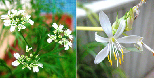 ちょーど、パクチーの花やオリヅルランの花が室内に咲いた日、