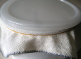 最近、蓋は、ふきん+太めゴム+容器に添付されてたプラスチックの蓋を上に置く。