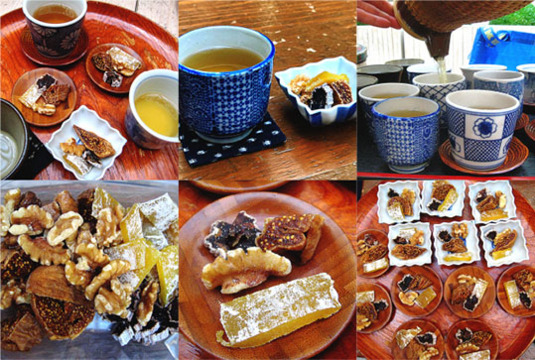 先生自家製の、ドライフルーツ(イチジク、柿)や干し芋、くるみなど、ほっこりのお菓子たち。