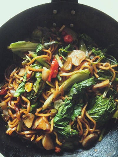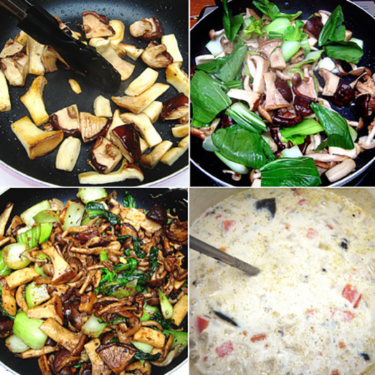 中国=五香粉を使って、チンゲンサイとキノコ3種の炒め。