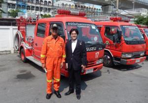 (画像は、バンコク都に配備された福岡県古賀市の消防車の前で撮影。)