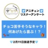 ☆アンケートコーナー回答募集中☆ 『チョコ苦手そうなキャラ!何あげたら喜ぶ!?』 ①お題の回答 ②回答アニメに関する楽曲のリクエスト 自由回答です!リプライで送ってね💁✨ あなたのリクエスト曲が...