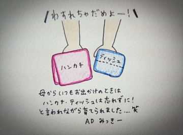 わたしは母に小さい時からお出掛けには必ずハンカチ・ティッシュを忘れずに持っていくことを強く教えられながら育てられたので今でも出掛ける時にどちらかを忘れてしまうとソワソワしちゃいます(笑)