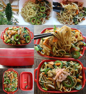 ・ファームで育ったゴーヤや旬の根菜などで、麺くっつかない具沢山ゴーヤキソバ弁当♪