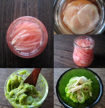 ・自家製紅生姜、自家製生姜甘黒酢漬、アボカドと紅生姜混ぜたん、オクラと紅生姜混ぜたん