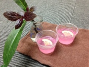 レモンの果汁をぎゅっと絞ると綺麗なピンクいろに変わります。