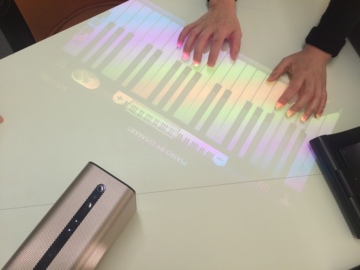 壁やテーブルがスマートスクリーンになる、家庭用のプロジェクター…ということなんですが、従来のプロジェクターとは違い、テーブルや壁に映像を写しだして、投影したスクリーンをタッチで操作できるんです!!