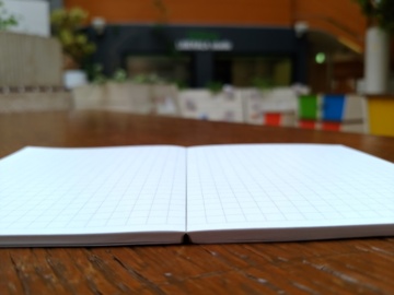一般のノートや冊子は折り目の中心部分が膨らむため書きにくくコピーしずらいですが、ナカプリバインは、180度に水平びらきし膨らみがないんです!