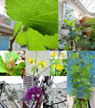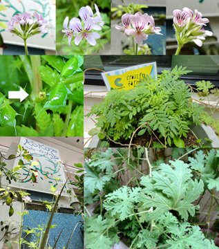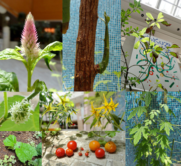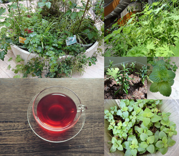 (ケイトウ(ピンクのとんがりコーン)、アボカド(幹や葉)、桑の実、ゴーヤの新芽、マイクロトマト、ゴーヤわさわさ、ハーブたち、ローズヒップティー)