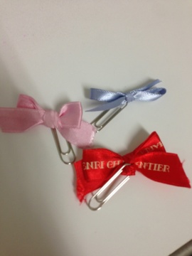 シルバーのクリップに、リボンを結び付ける。