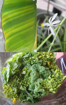 ・モンキーバナナの虎柄葉っぱ、めでたい羽ばたき〜オリヅルラン、菜の花のブーケ