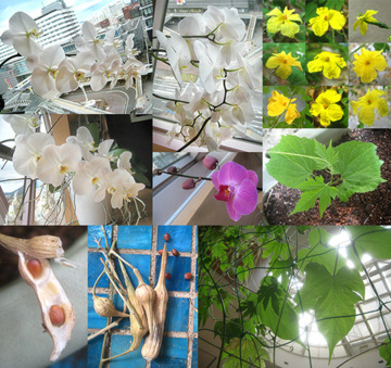 ・胡蝶蘭たち、ゴーヤの花たち、ドヤ顔ゴーヤの芽&本葉、ミニ大根の莢&種、ゴーヤとアサガオの葉っぱコラボ