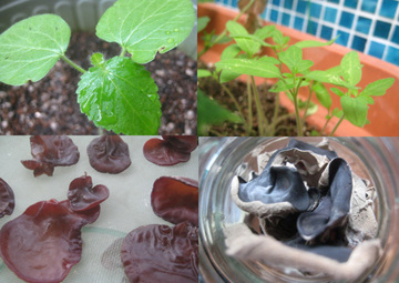「オクラの本葉、謎の芽!、キクラゲ(天日干し前、干し後)」